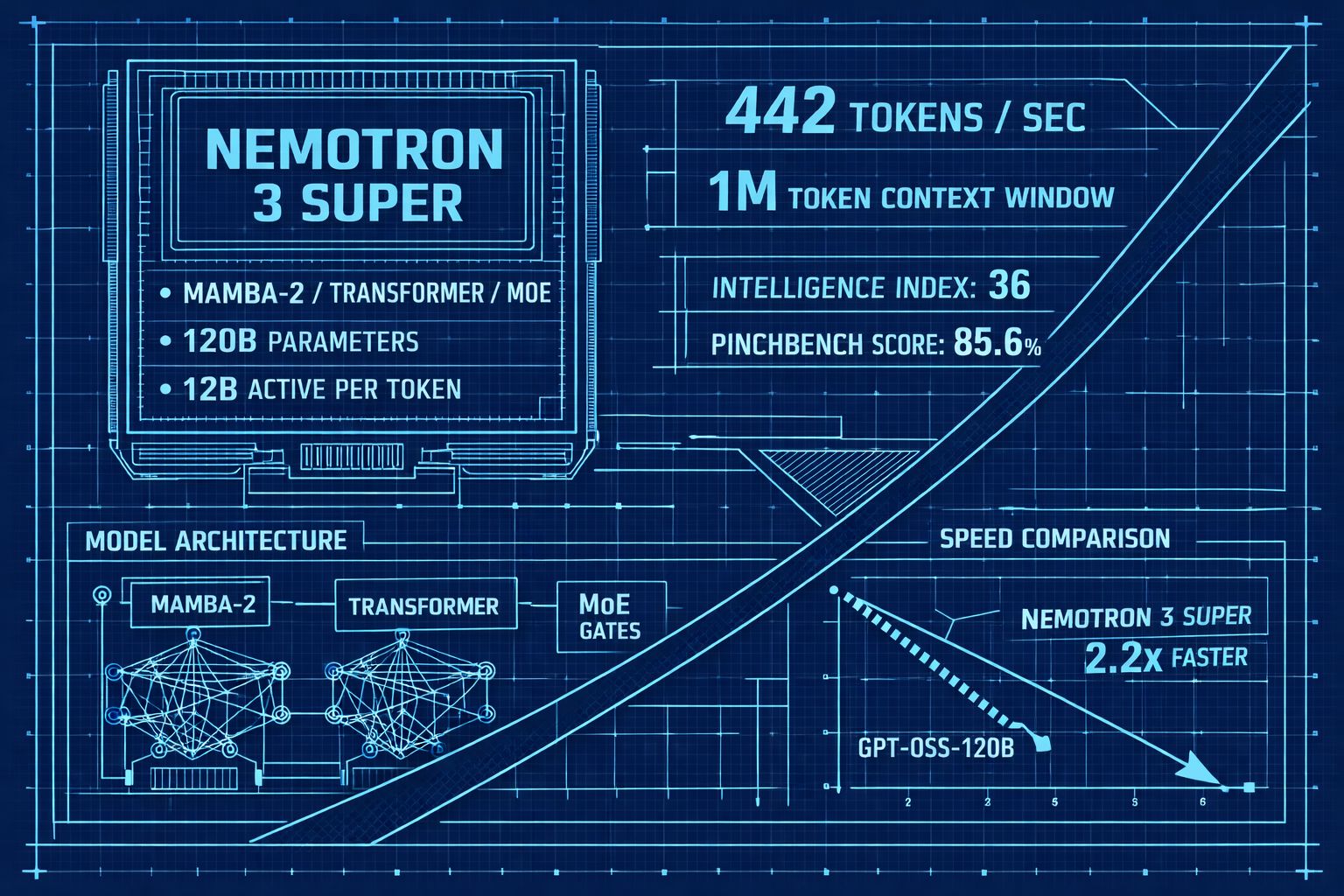 1. Nvidia lanza el modelo abierto más rápido del mundo: Nvidia lanzó Nemotron 3 Super, un modelo abierto de 120.000M de parámetros que activa solo 12.000M por token gracias a una arquitectura híbrida Mamba-2/Transformer/MoE. El resultado: ~442 tokens por segundo, 2,2x más rápido que gpt-oss-120B de OpenAI, con una ventana de contexto de 1M de tokens. Puntúa 36 en el Intelligence Index de Artificial Analysis (vs 33 de gpt-oss) y lidera PinchBench con un 85,6% en tareas agénticas, superando a modelos 8x más grandes en parámetros activos. Pesos, datasets y recetas de entrenamiento son totalmente abiertos. A 0,30/0,75/0,75 /0,75 por millón de tokens, es el primer líder open-weights estadounidense desde Llama 4, respaldado por el compromiso de 26.000M$ de Nvidia con el desarrollo de IA abierta durante cinco años.