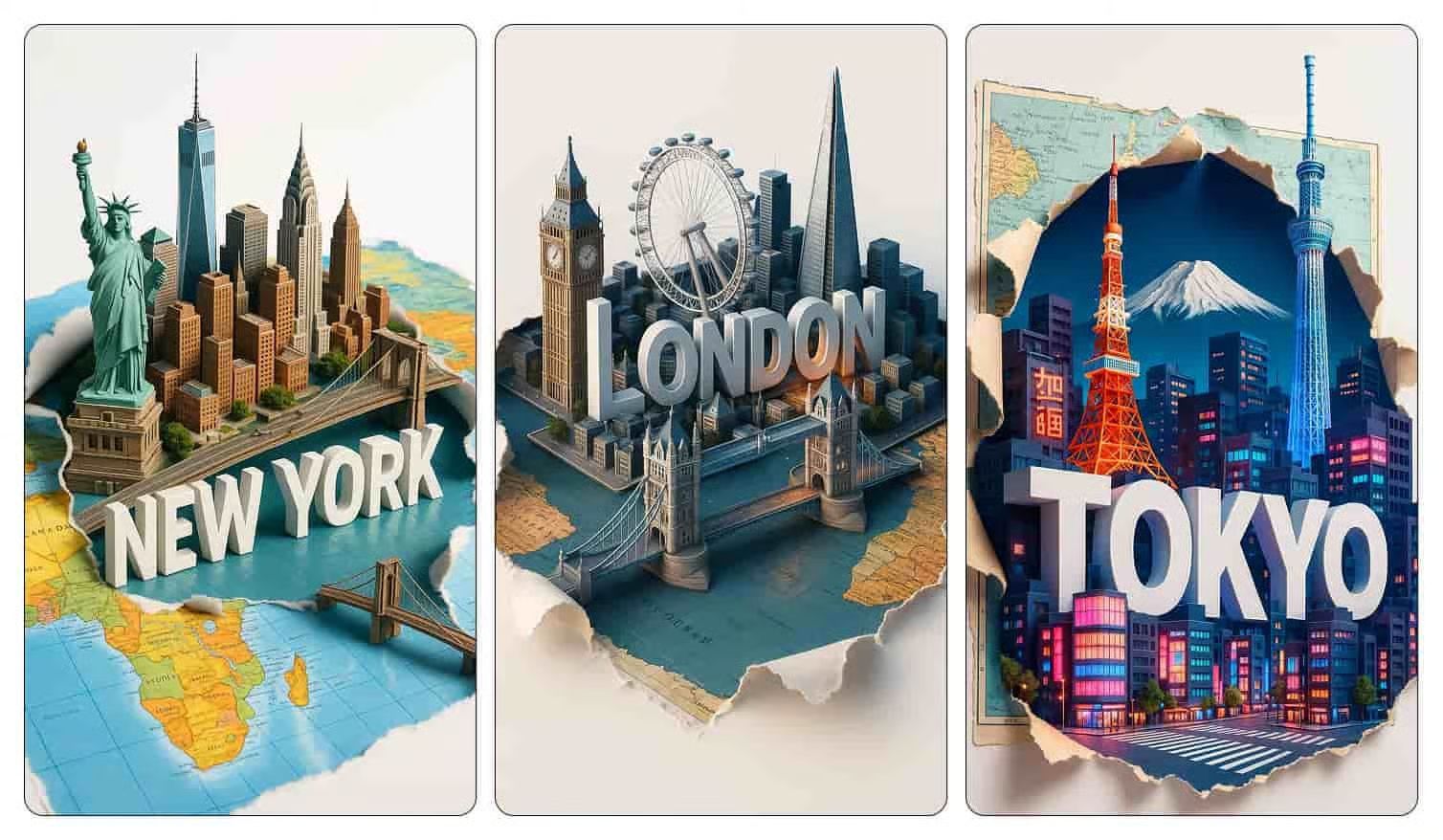 Crea un póster elegante en formato [relación de aspecto 2:3] que muestre una maqueta 3D en miniatura de [nombre de la ciudad], destacando sus monumentos más emblemáticos como [mencionar 3–4 lugares importantes], emergiendo a través de un mapa físico del mundo rasgado horizontalmente, integrándose de forma fluida en el diseño.