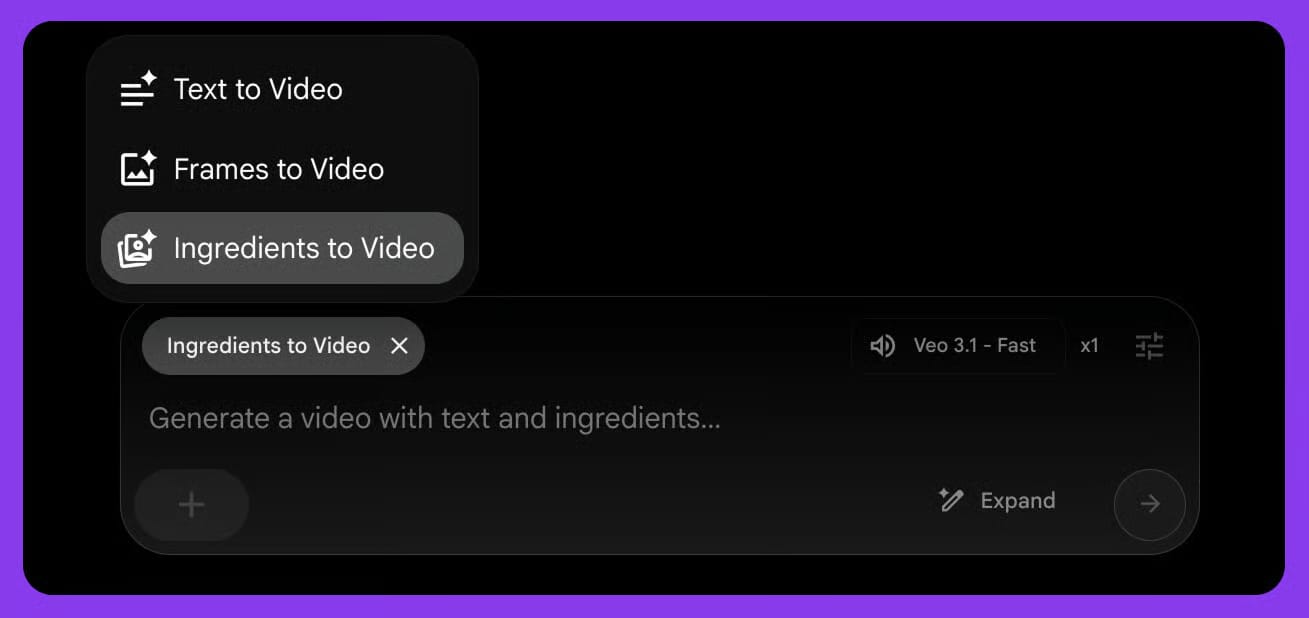 En el menú de modos, cambia de “Texto a vídeo” a “Ingredientes a vídeo”.