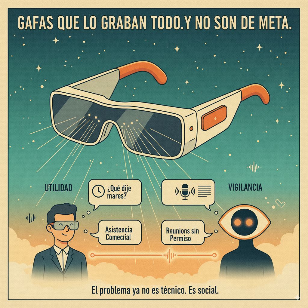 Las gafas transcriben todo el audio y borran los archivos originales. Solo queda texto. Casos de uso: