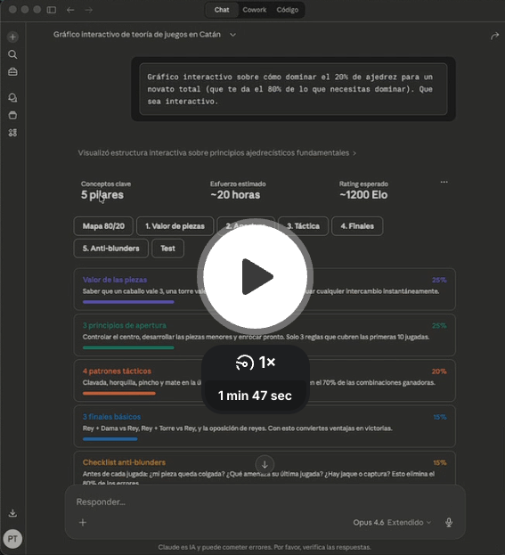 Gráfico interactivo sobre cómo dominar el 20% de ajedrez para un novato total (que te da el 80% de lo que necesitas dominar).💡 Consejo: Sigue pidiéndole más tácticas. No encontré el final. Claro, webs especializadas como chess.com son mucho mejores que Claude para enseñarte ajedrez. Pero, ¿hasta cuándo? Claude tiene 3 años. ¿Qué pasa con Claude dentro de 3 años?
