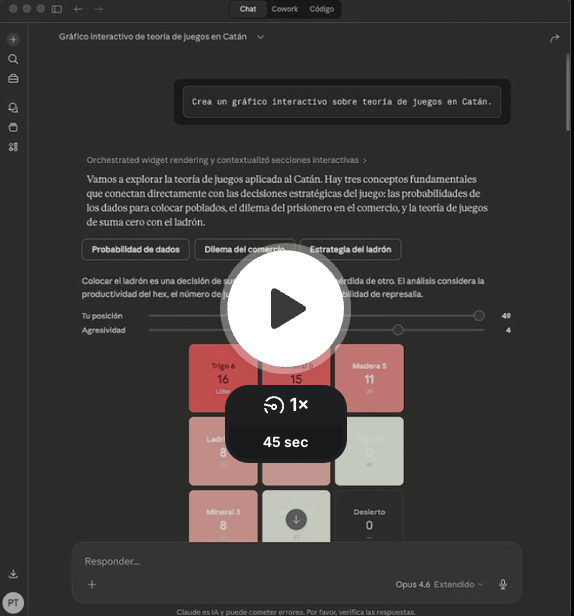 No programes. Solo gráfico interactivo.💡 Consejo: A veces necesitas forzar el modo Gráfico añadiendo "No programes. Solo gráfico interactivo." al final del prompt. Funciona siempre.