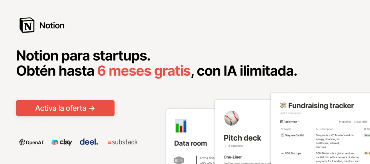 Miles de startups utilizan Notion como un espacio de trabajo conectado para crear y compartir documentos, tomar notas, gestionar proyectos y organizar el conocimiento, todo en un mismo lugar. ¡Estamos ofreciendo 6 meses del nuevo plan Plus, que incluye Notion AI ilimitado para que puedas probarlo todo gratis!