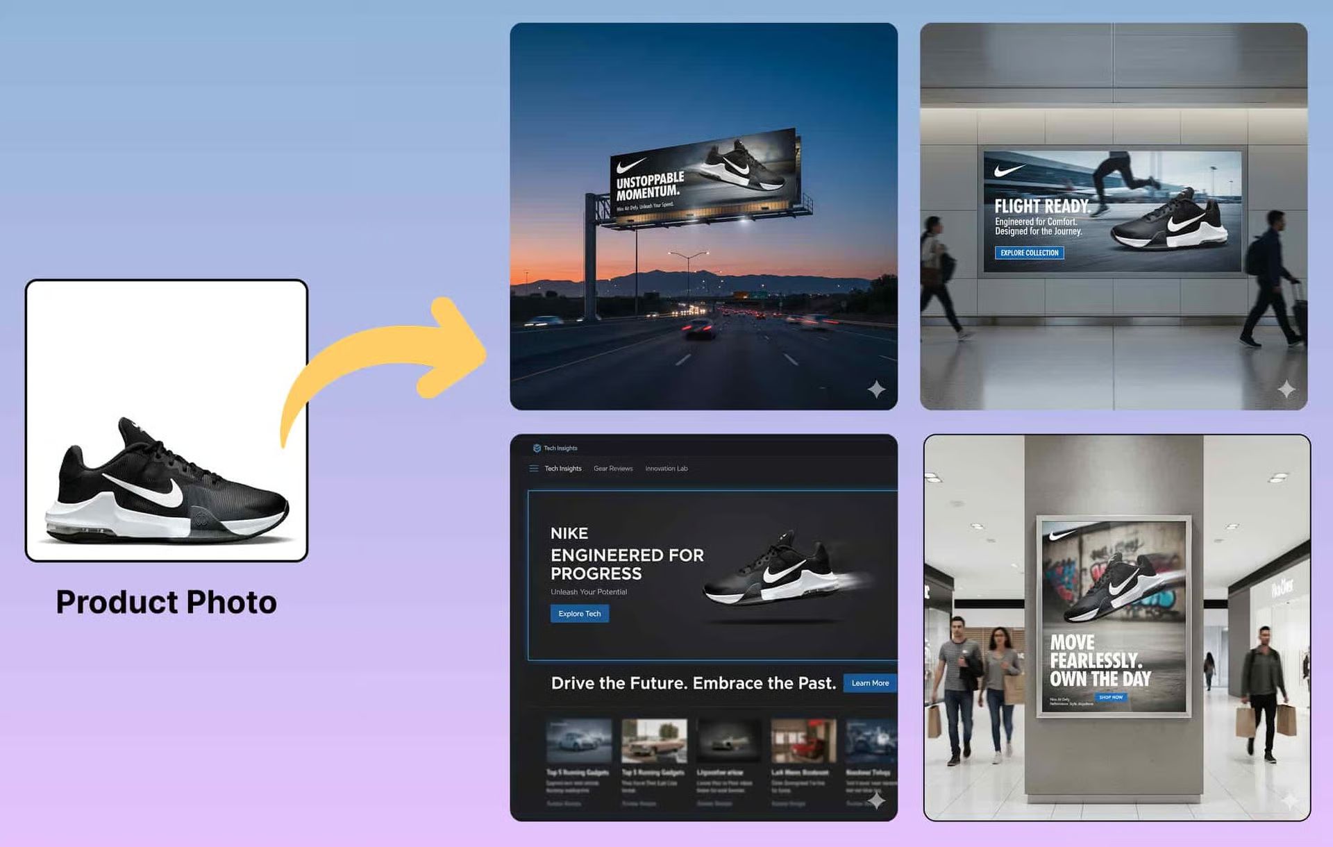 Prompt de ejemplo: "Genera mockups publicitarios de la imagen adjunta para cuatro entornos —pantalla de aeropuerto, póster de centro comercial, valla publicitaria de autopista, y banner de blog tecnológico/web— manteniendo la consistencia de marca y adaptando el estilo a cada configuración."
