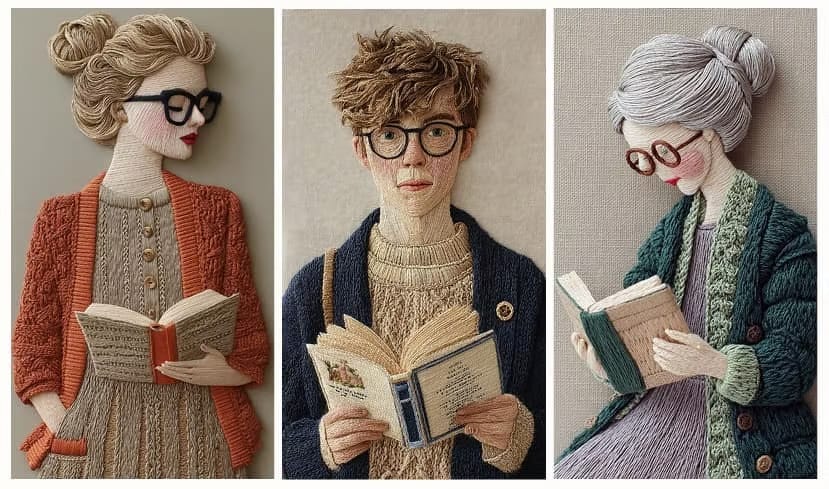 Una ilustración de arte textil altamente detallada de un [sujeto/descripción del personaje], elaborada íntegramente con hilo y hebras de bordado. Tiene [color y estilo de cabello hechos de hilo], [rasgos faciales/accesorios como gafas, mejillas sonrojadas, arrugas, labios, etc.] y viste una [prenda principal con textura de tela] combinada con una [prenda exterior con textura, color y detalles distintivos como botones o mangas]. Una mano [acción con un libro — p. ej., sosteniendo un libro abierto con tapa beige y borde de color], mientras que la otra [gesto casual — en el bolsillo, sobre el regazo, descansando al costado, etc.]. Toda la obra está realizada con hilos, hebras y texturas de tela meticulosamente dispuestos sobre un fondo de lienzo neutro, mostrando una atención extrema al detalle en [mechones de cabello tejidos, patrones de ropa de punto, puntadas de bordado, etc.].🛠️ Herramientas IA